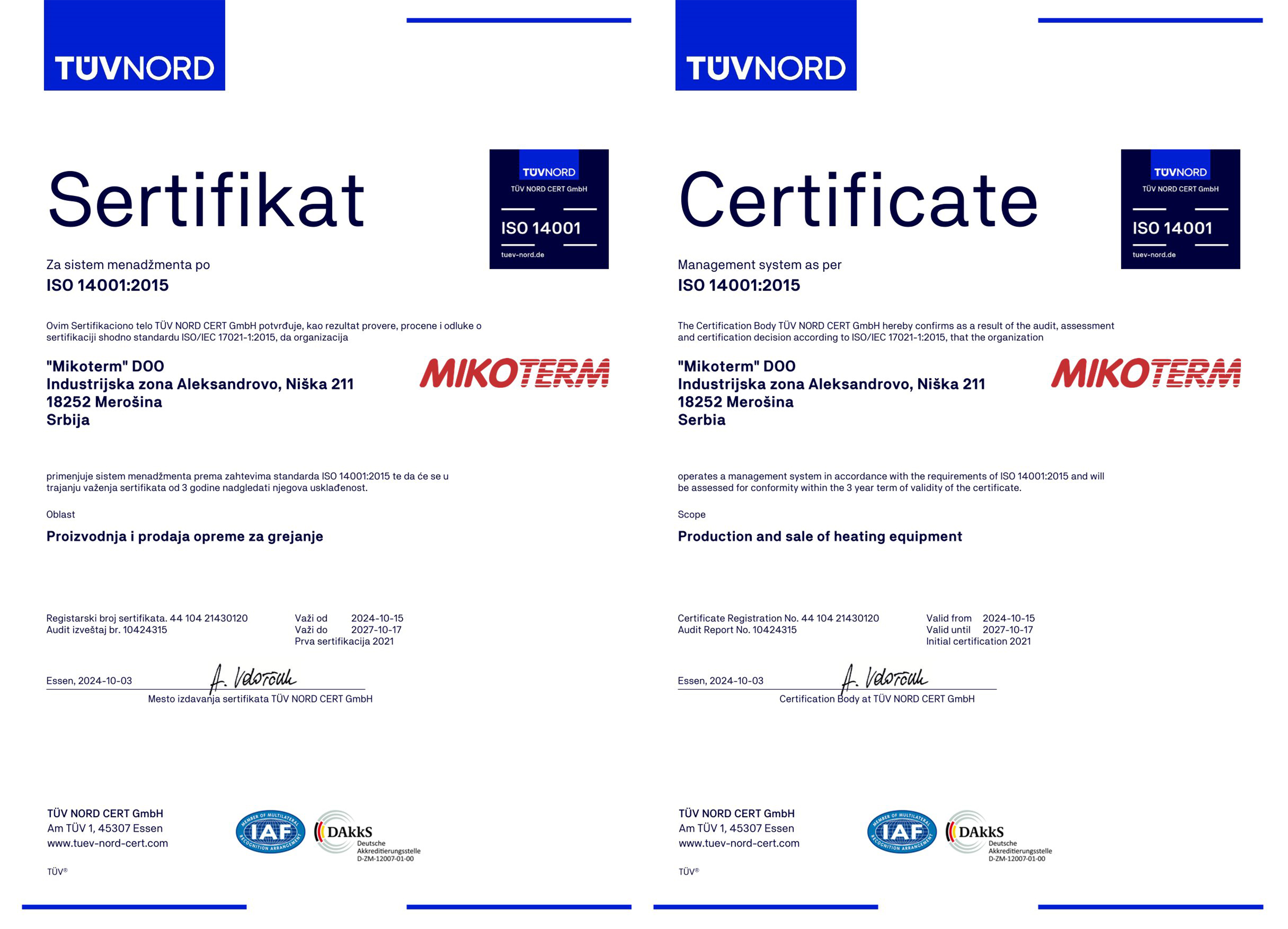 Sertifikati Kvaliteta i Standardi Proizvodnje | Mikoterm ISO 9001:2015 Sistem menadžmenta kvalitetom Preuzmite PDF ISO 14001:2015 Sistem menadžmenta životnom sredinom Preuzmite PDF ISO 45001:2018 Sistem upravljanja zaštitom zdravlja i bezbednošću na radu Preuzmite PDF Sertifikat platinaste bonitetne izvrsnosti Platinasta bonitetna izvrsnost = Zlatni AAA rejting tri godine zaredom Sertifikat – ENG Sertifikat – SRB